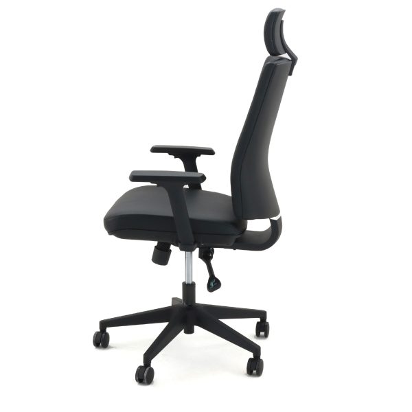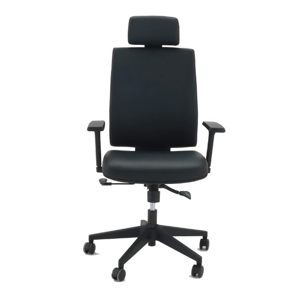 Dossier haut avec appuie-tête intégré pour un soutien cervical parfait. Matériau rembourré premium, accoudoirs réglables et options d'ajustement multiples. Base robuste à cinq branches avec roulettes doubles pour stabilité et mobilité.