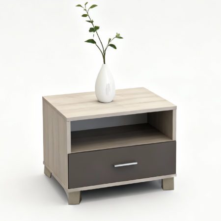 Table de Nuit Perla : Un table de nuit bicolore , Alliant une structure en bois clair à un tiroir de rangement taupe, elle propose une niche ouverte pour un accès rapide et un tiroir avec poignée chromée. Un meuble simple, robuste et élégant, idéal pour une chambre ordonnée.