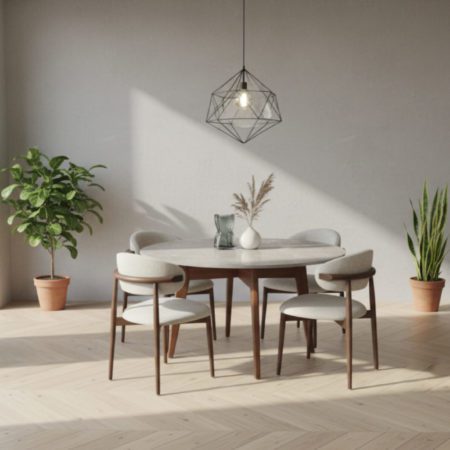 L’élégance organique au cœur de votre foyer avec le charme intemporel de l’ensemble Laguna & Victor. Cette table ronde en bois massif, dotée d’un plateau à l’effet marbre gris, apporte une touche de luxe minéral à votre intérieur. Accompagnée des chaises Victor au design ergonomique, elle crée un espace de