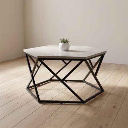 Une dimension sculpturale avec la table basse Hexa. Caractérisée par son plateau hexagonal et son socle métallique aux lignes croisées complexes, elle incarne le style contemporain chic. Disponible en deux finitions prestigieuses Socle Noir avec plateau effet Marbre Gris ou Socle Doré avec plateau effet Marbre Blanc cette table devient