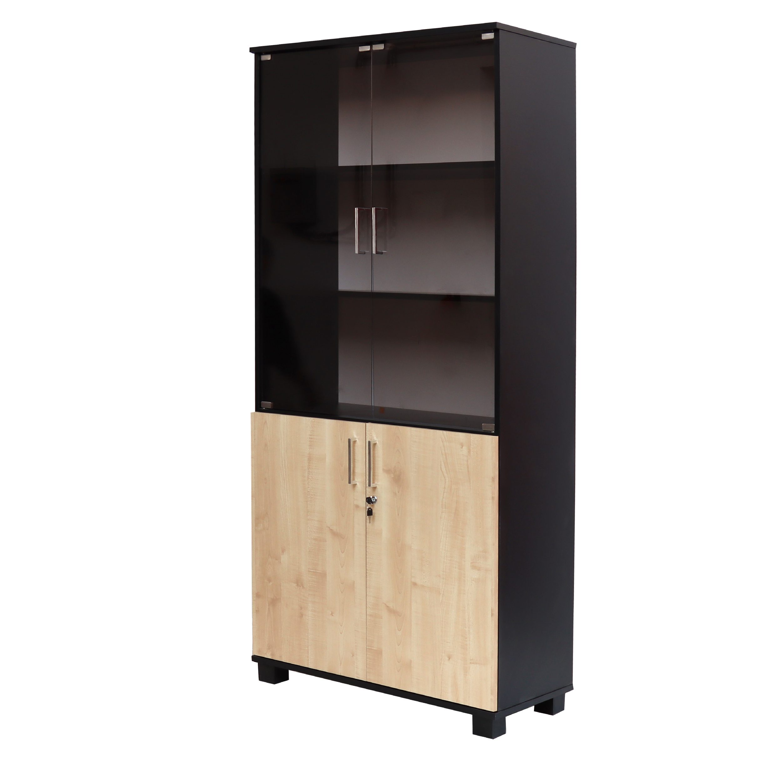 Élégant meuble de rangement bicolore (noir/bois ) avec 2 portes vitrées teintées en partie haute et 2 portes PVC finition bois avec serrure en partie basse.