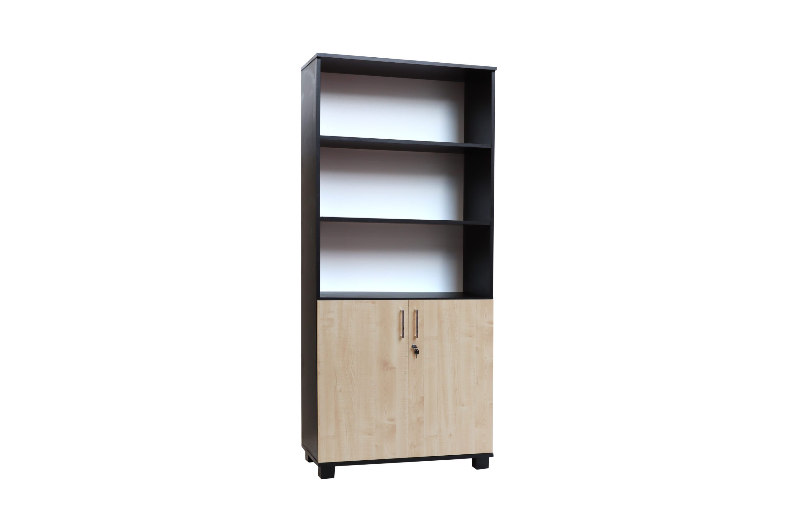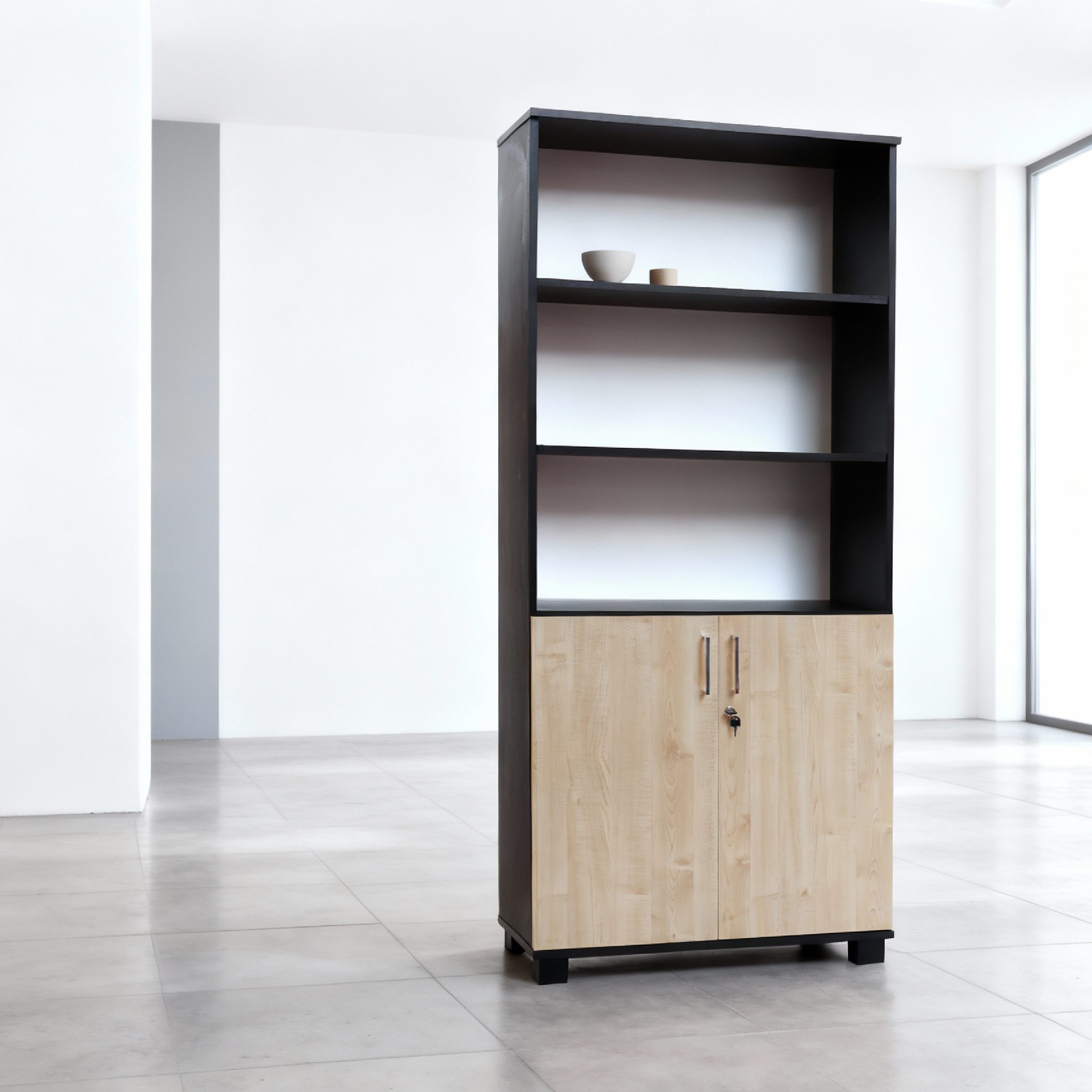 Meuble de rangement moderne, associant une structure noire mate à des portes en finition bois. Il dispose de trois étagères ouvertes et d’un placard inférieur sécurisé avec serrure.