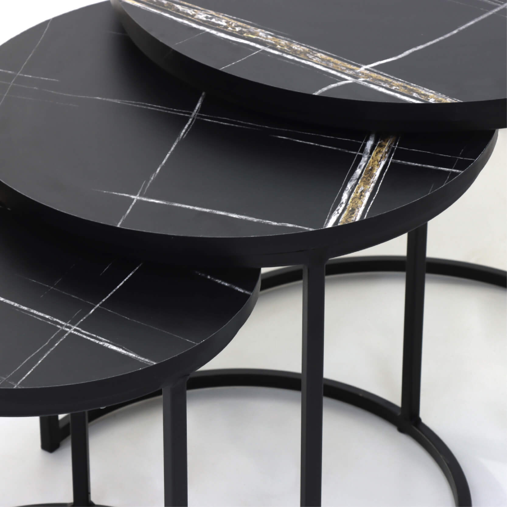Les socle sont en métal noir avec une structure minimaliste qui soutient chaque plateau de manière légère et élégante, tout en assurant la stabilité.
