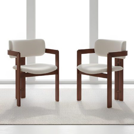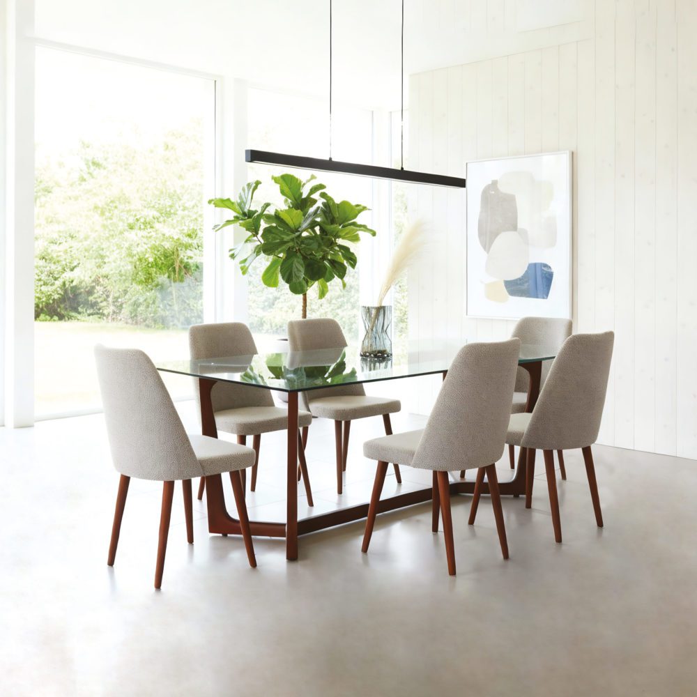 Pour contrebalancer la pureté du verre, les chaises Zoom apportent une texture riche et un accueil chaleureux. Leur dossier capitonné aux finitions soignées assure un confort optimal pour les longs dîners. La structure et les pieds en bois massif assortis au socle de la table créent une harmonie visuelle parfaite et une stabilité incomparable.