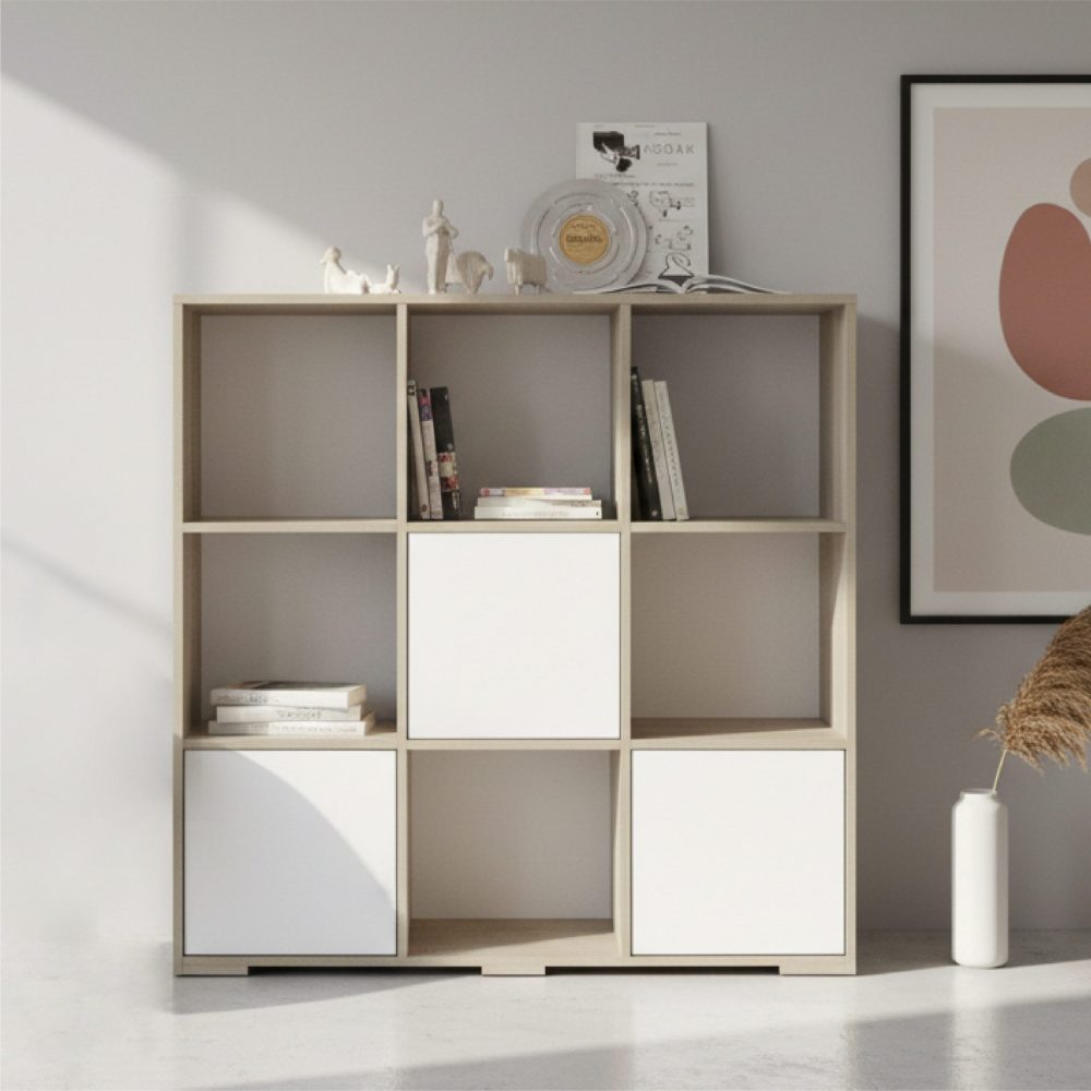Le meuble de rangement CUBIC est la solution idéale pour ceux qui recherchent un design moderne et structuré. Avec ses 9 niches spacieuses, dont 3 compartiments fermés par des portes blanches contrastantes, il offre un jeu visuel élégant tout en multipliant les possibilités de stockage. Son fini bois clair apporte une chaleur naturelle, idéale pour un salon, une entrée ou une chambre d’enfant.