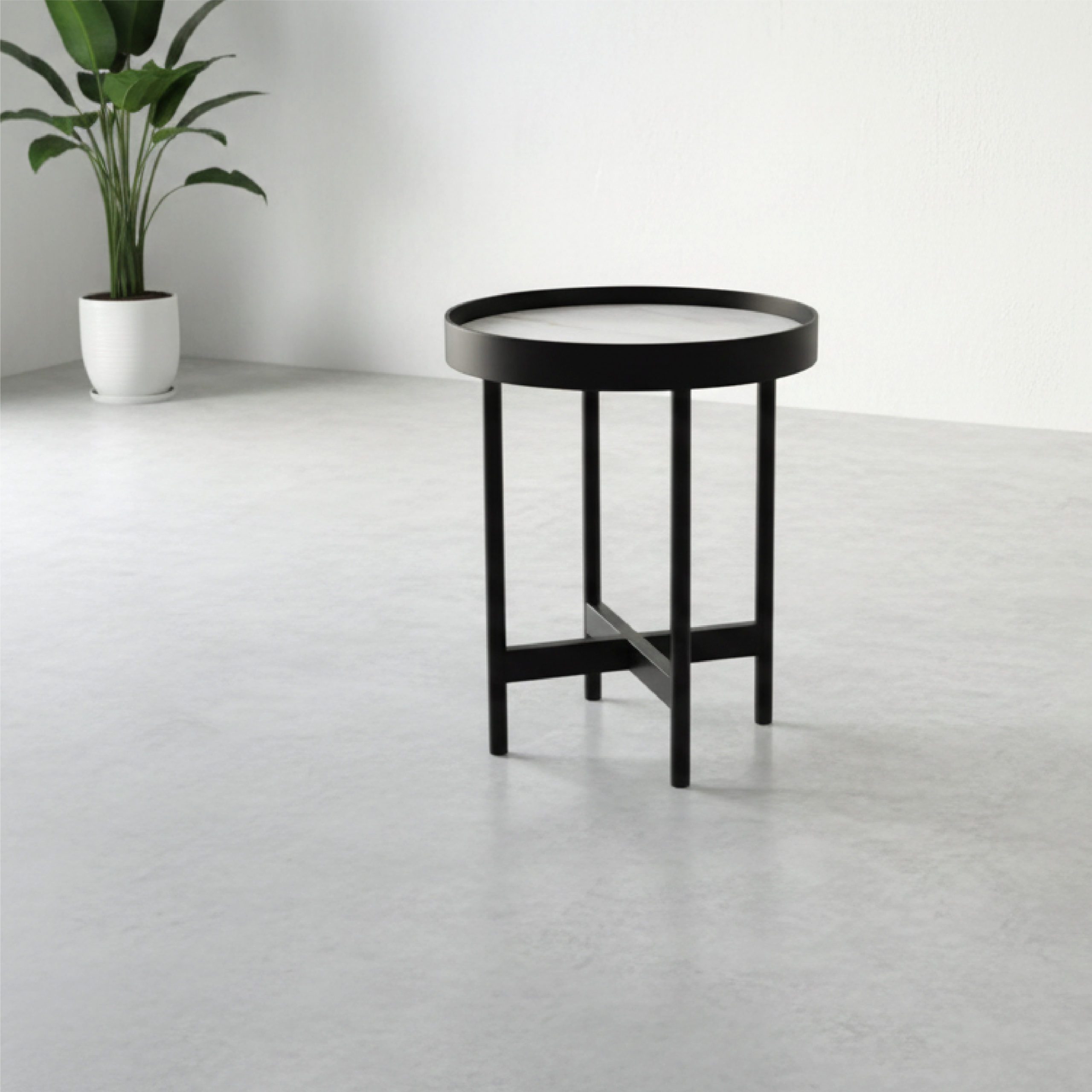 Un socle architectural robuste Reposant sur un piétement en croix iconique, la table d’appoint Palma assure une stabilité irréprochable. Sa structure en métal noir mat apporte une touche industrielle chic qui s’intègre harmonieusement dans un salon, une chambre en guise de table de chevet, ou un coin lecture.