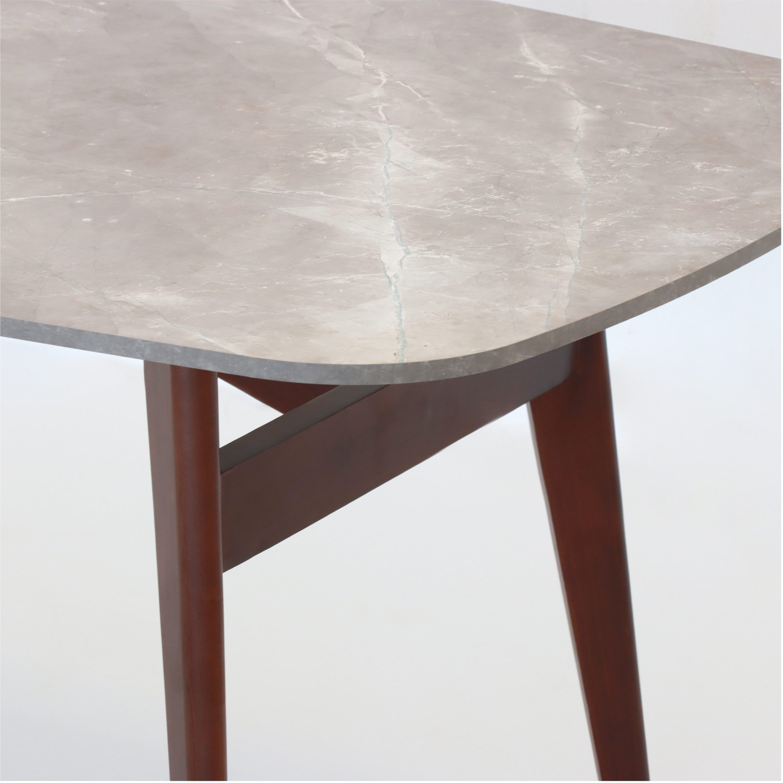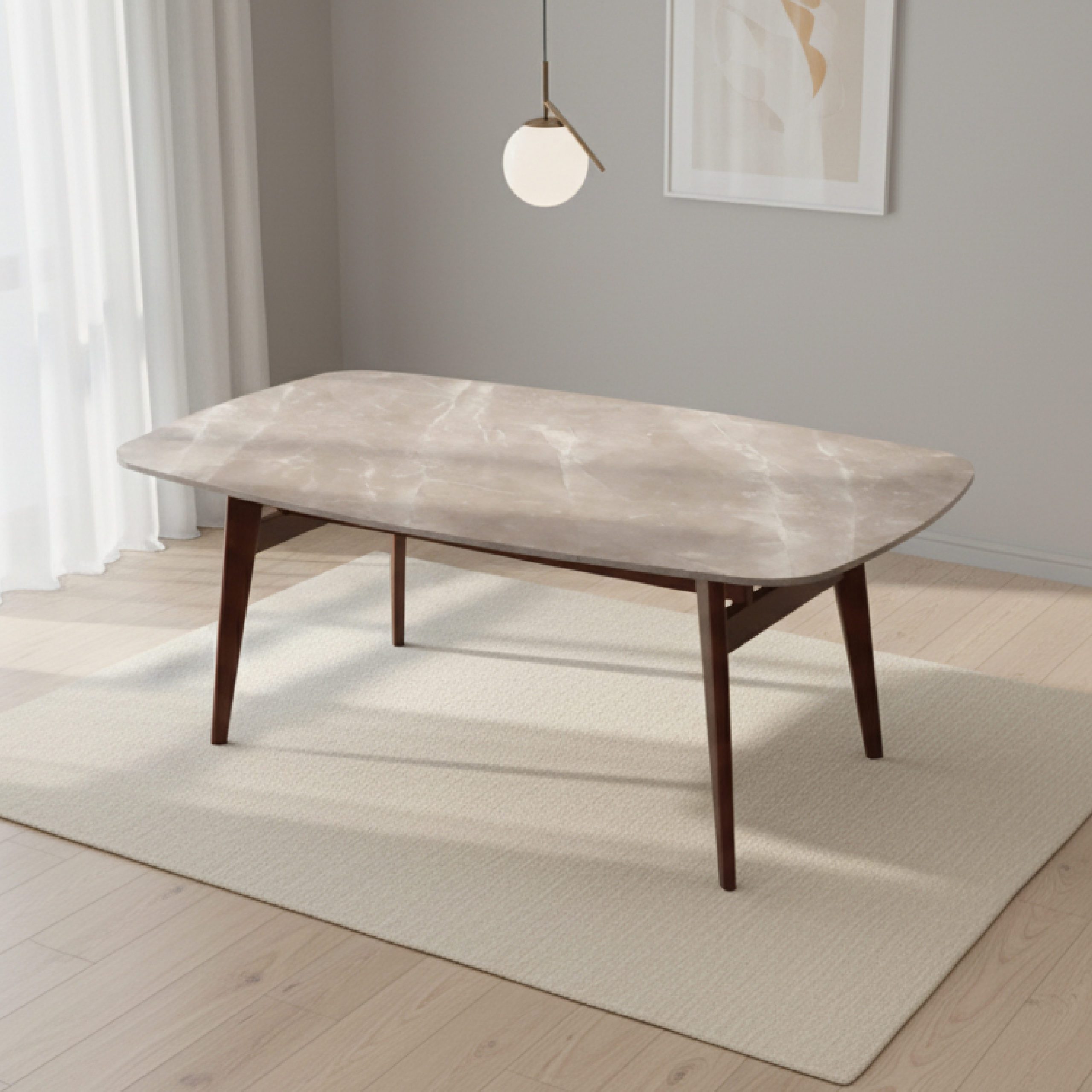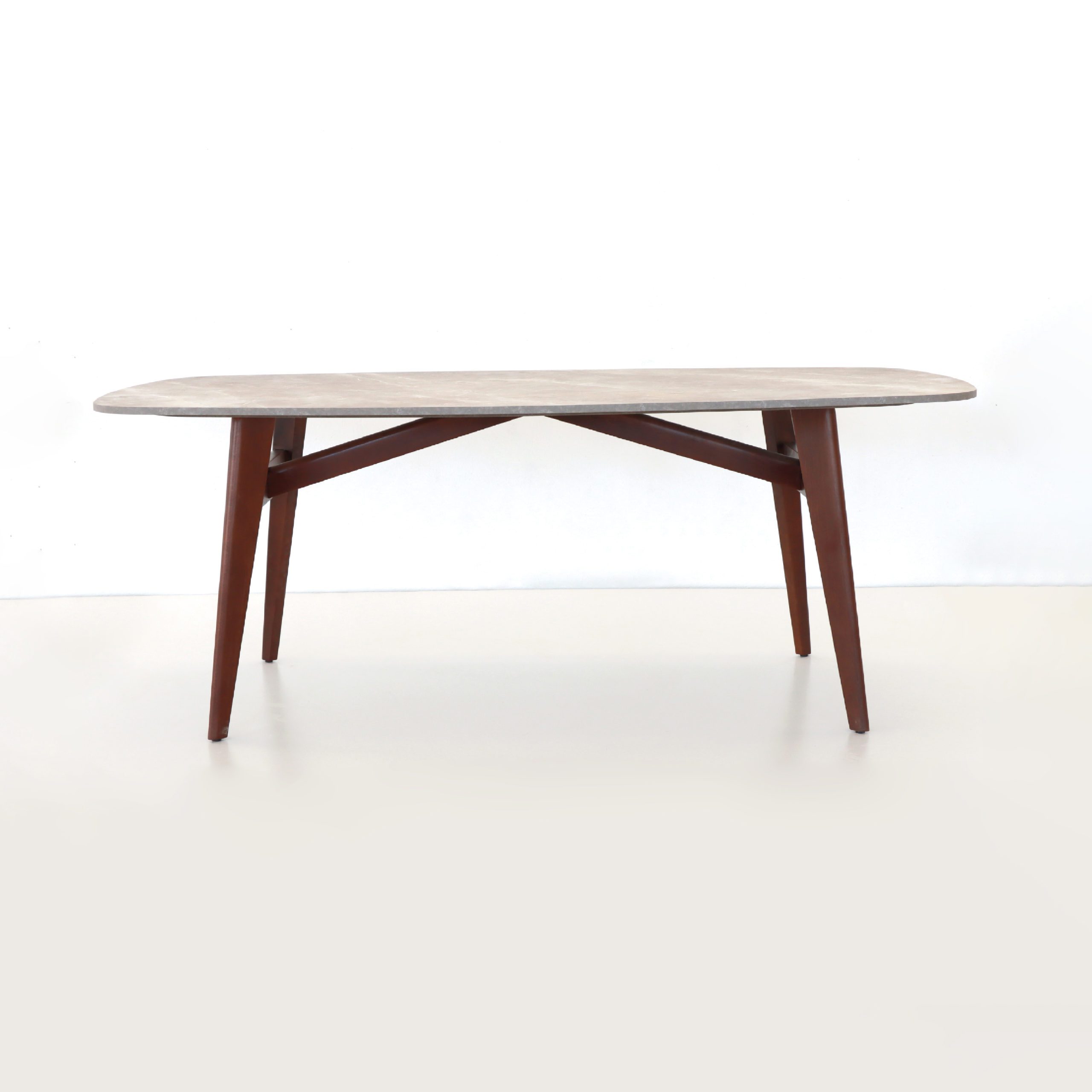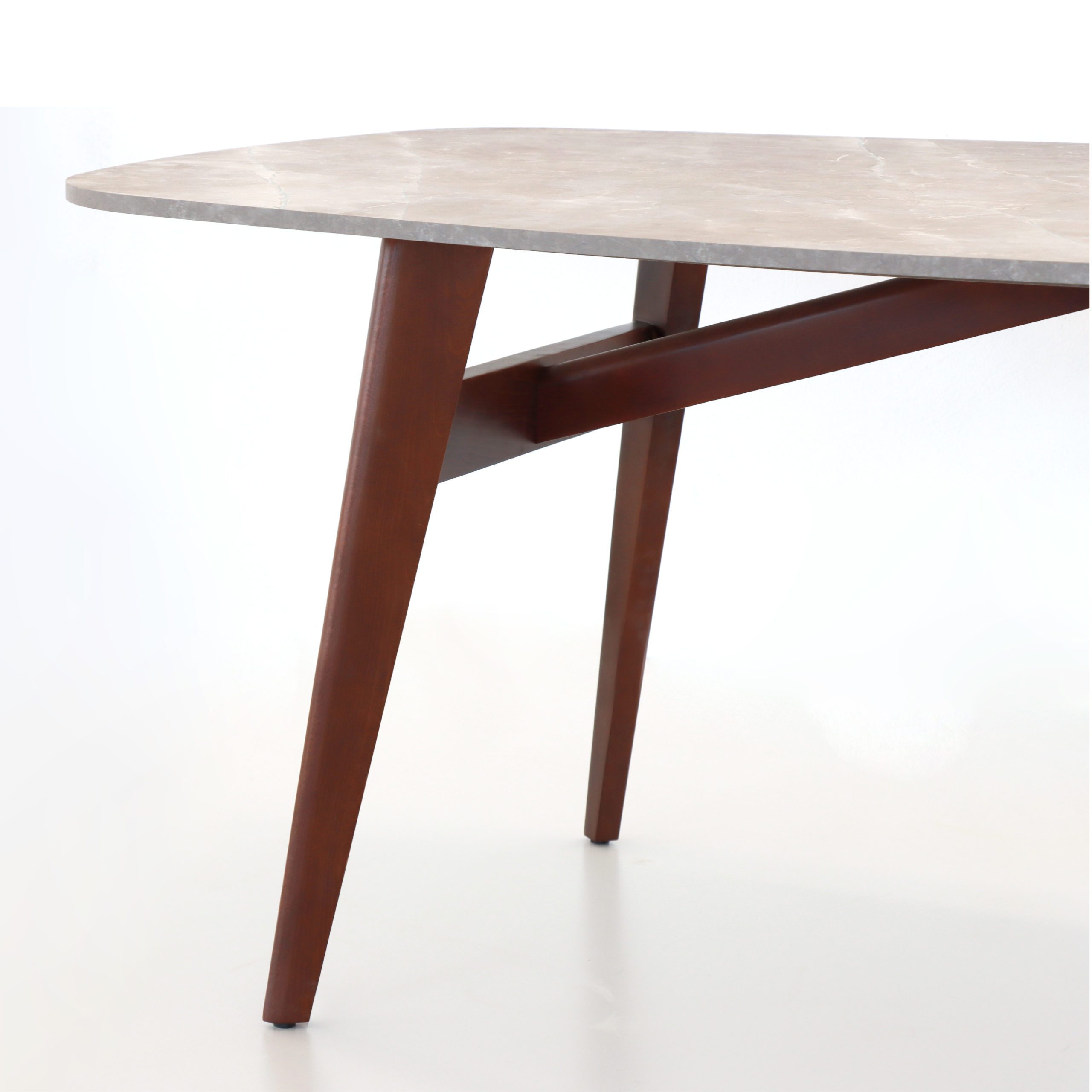 Le cœur de la table Laguna réside dans son piétement en bois massif de noyer. Réputé pour sa robustesse et sa teinte profonde, le noyer apporte une chaleur naturelle incomparable. Le travail du bois, aux courbes douces et aux angles précis, souligne un savoir-faire artisanal de haute volée qui garantit une stabilité parfaite sur le long terme.